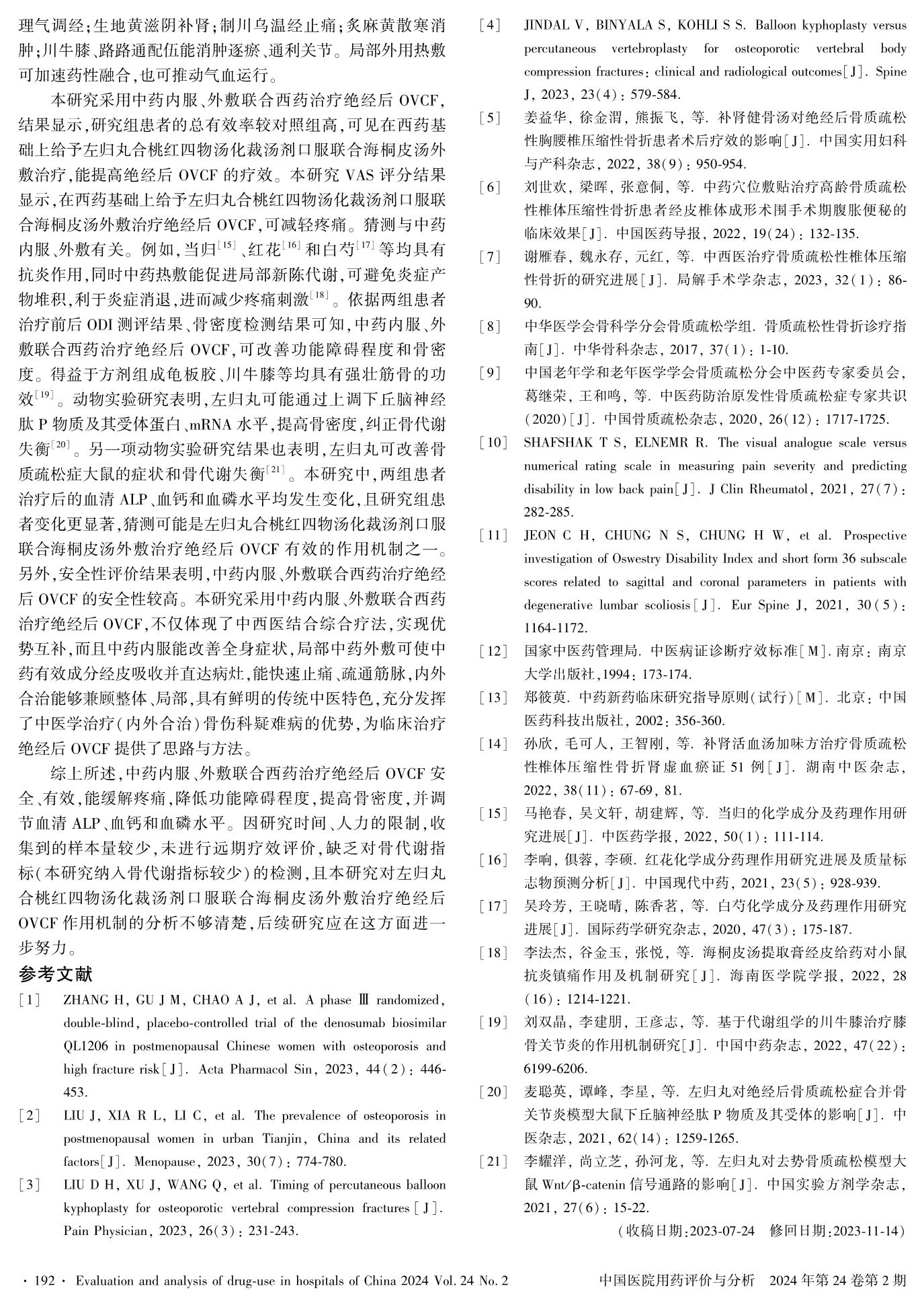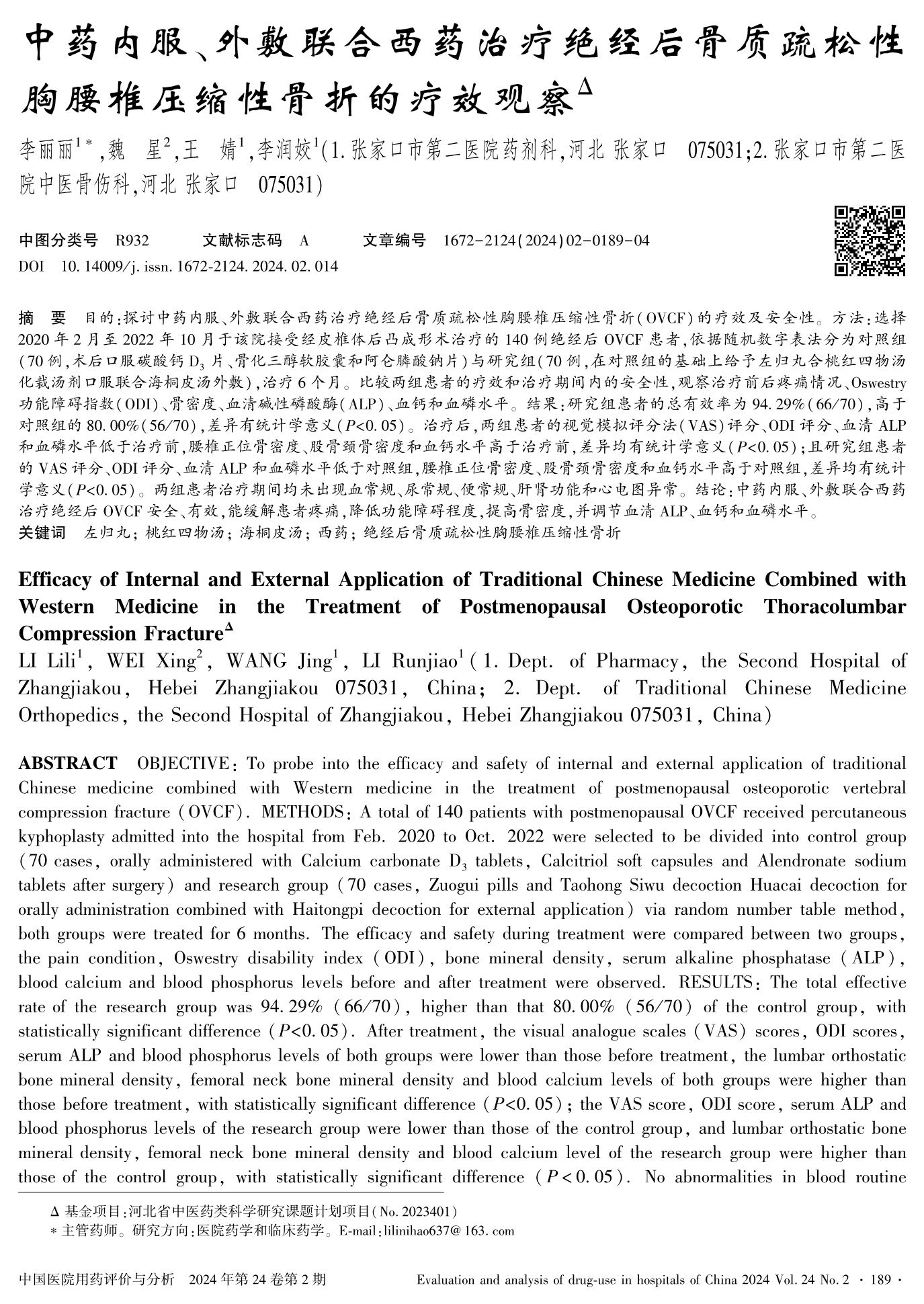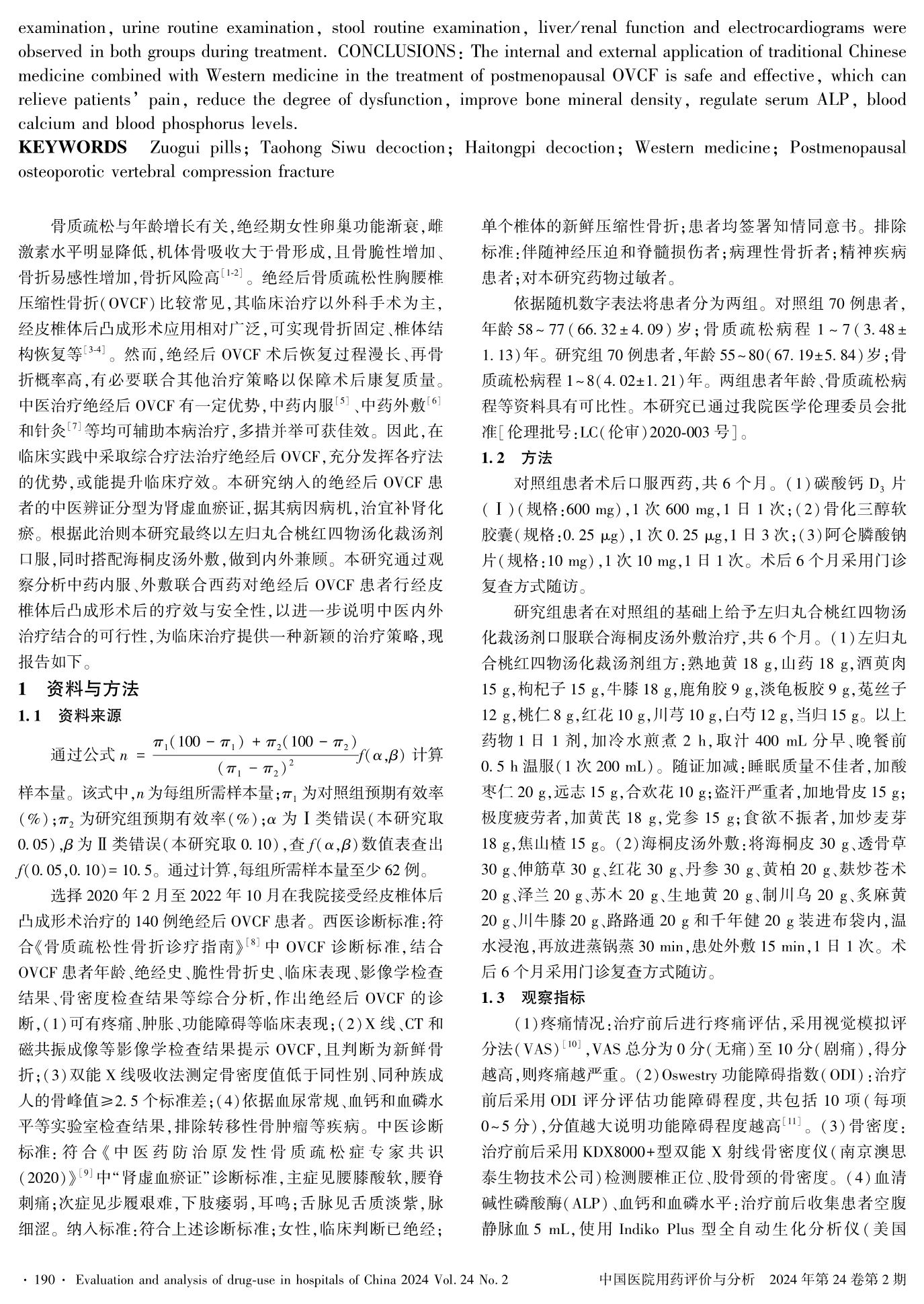 Efficacy of Internal and External Application of Traditional Chinese Medicine Combined with Western Medicine in the Treatment of Postmenopausal Osteoporotic Thoracolumbar Compression Fracture