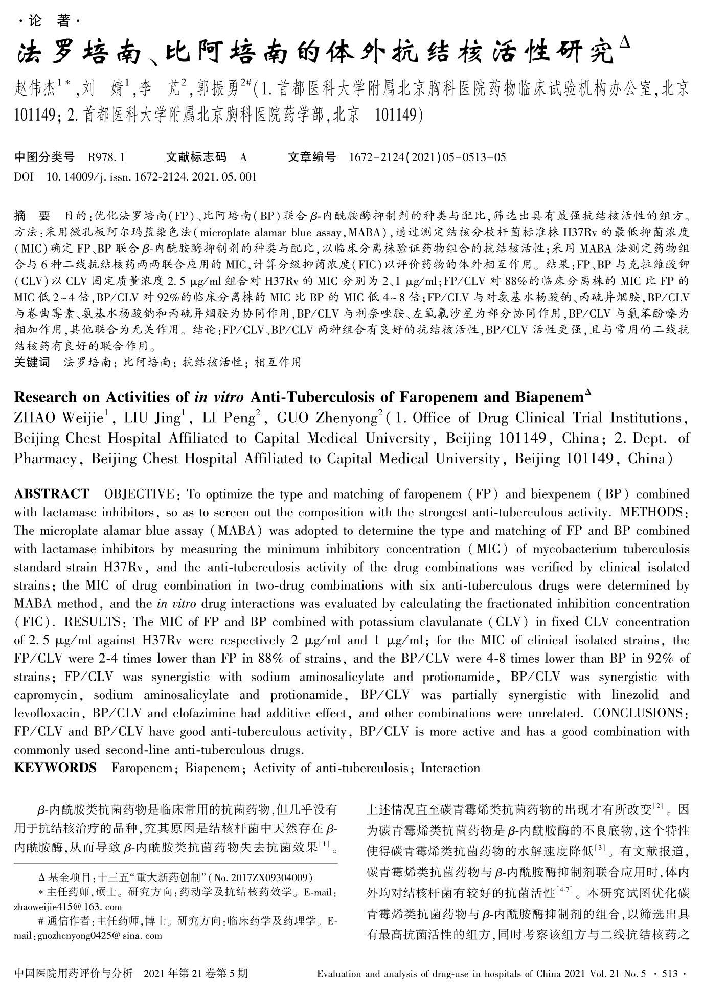 法罗培南、比阿培南的体外抗结核活性研究