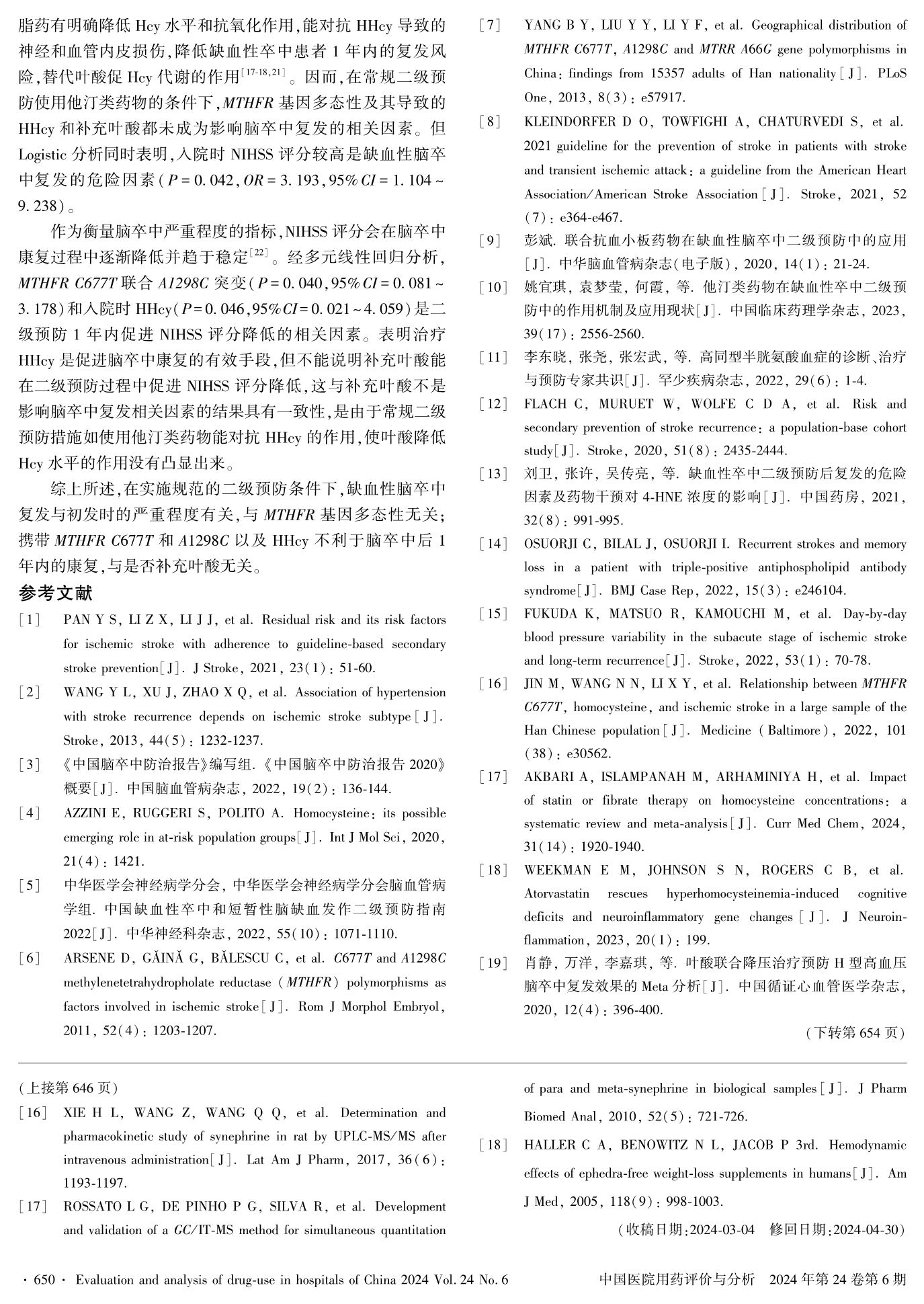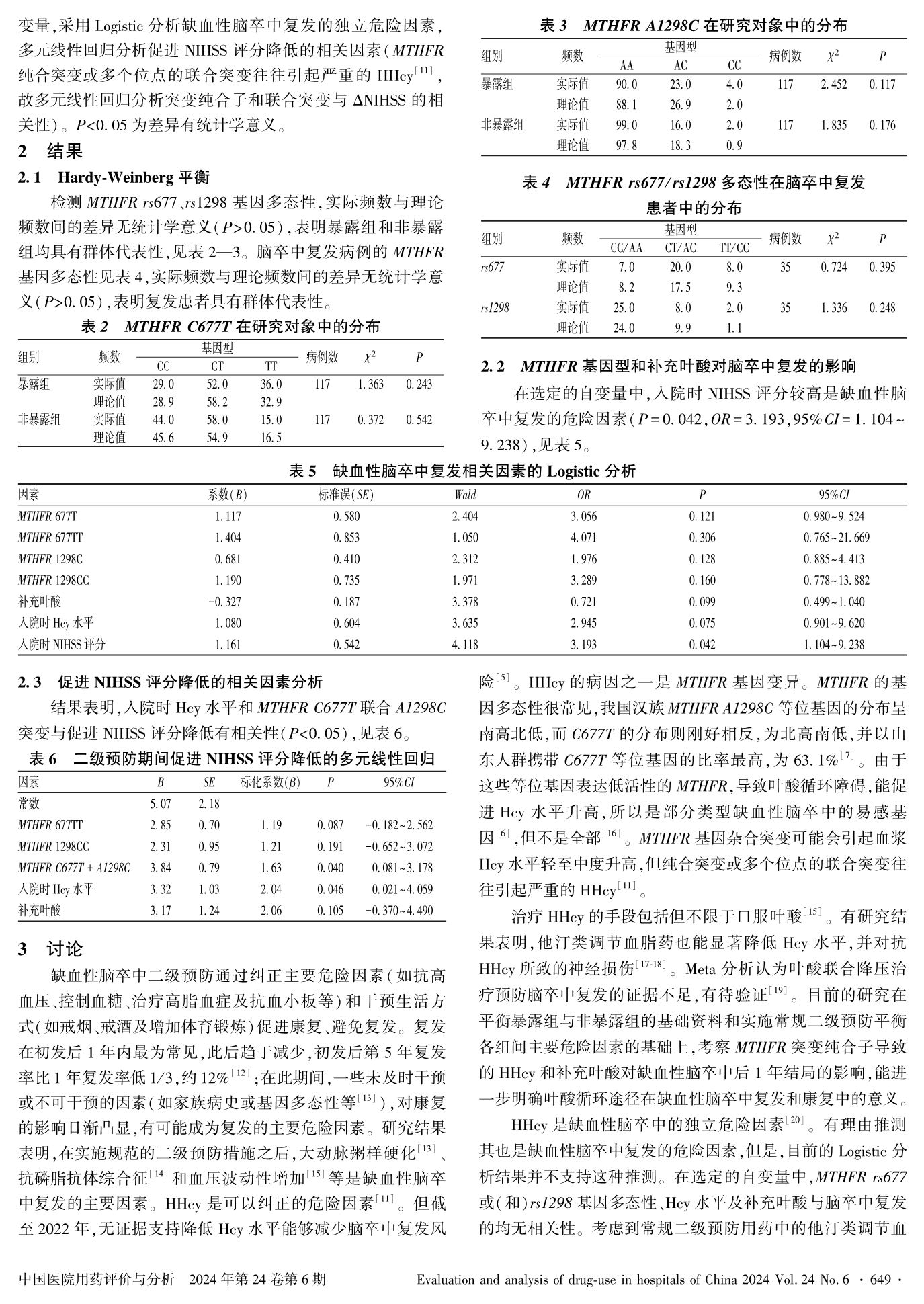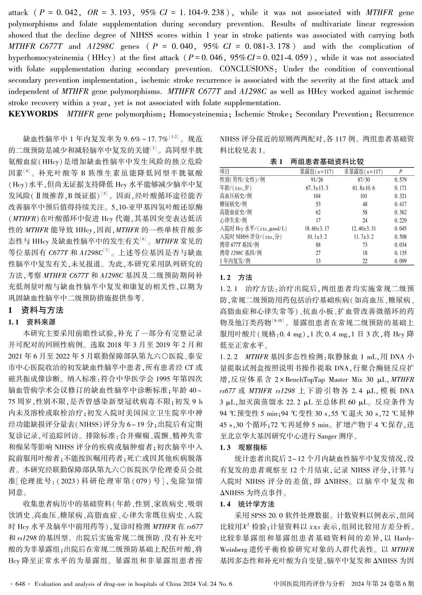 Effects of MTHFR Gene Polymorphism and Folate Supplementation onOne-Year Outcome of Secondary Prevention for Ischemic Stroke