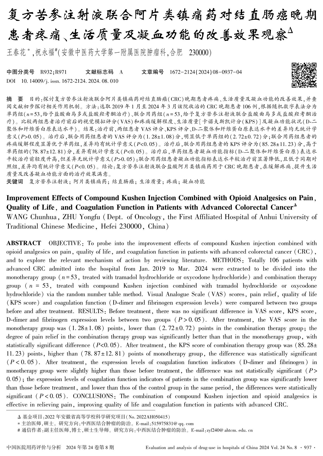 Improvement Effects of Compound Kushen Injection Combined with Opioid Analgesics on Pain, Quality of Life, and Coagulation Function in Patients with Advanced Colorectal Cancer