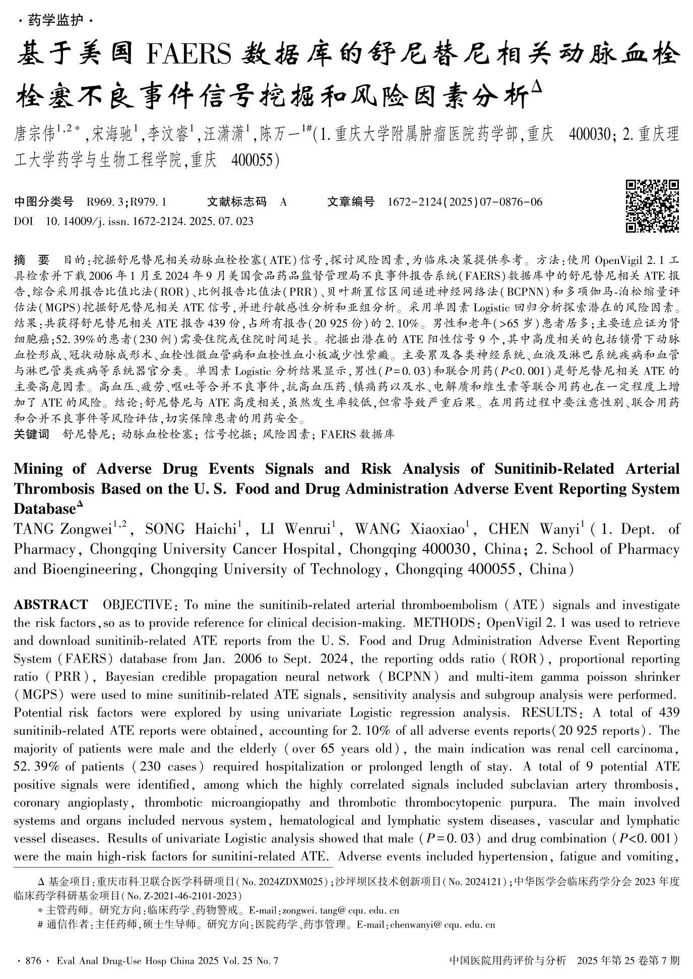 Mining of Adverse Drug Events Signals and Risk Analysis of Sunitinib-Related Arterial Thrombosis Based on the U. S. Food and Drug Administration Adverse Event Reporting System Database