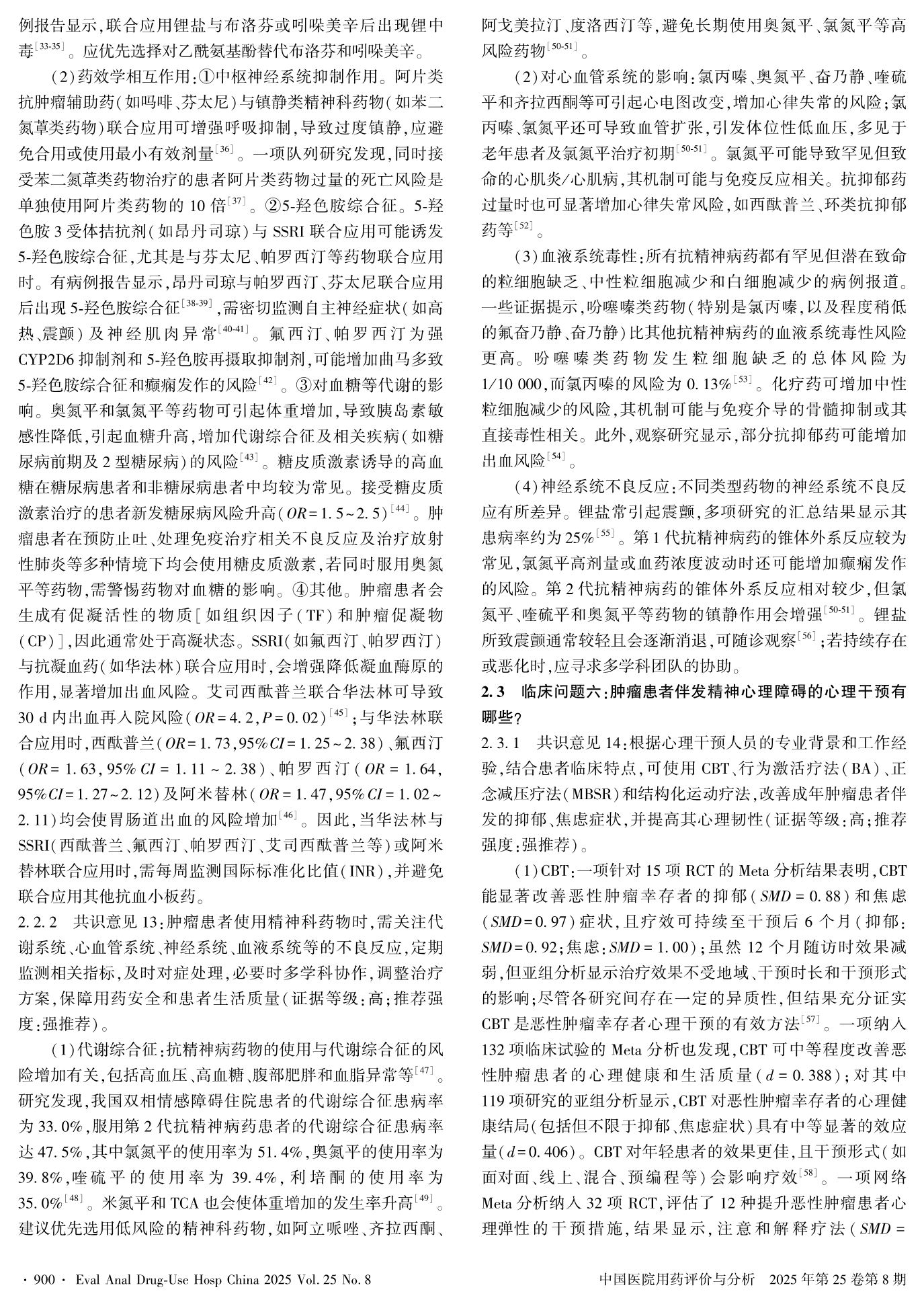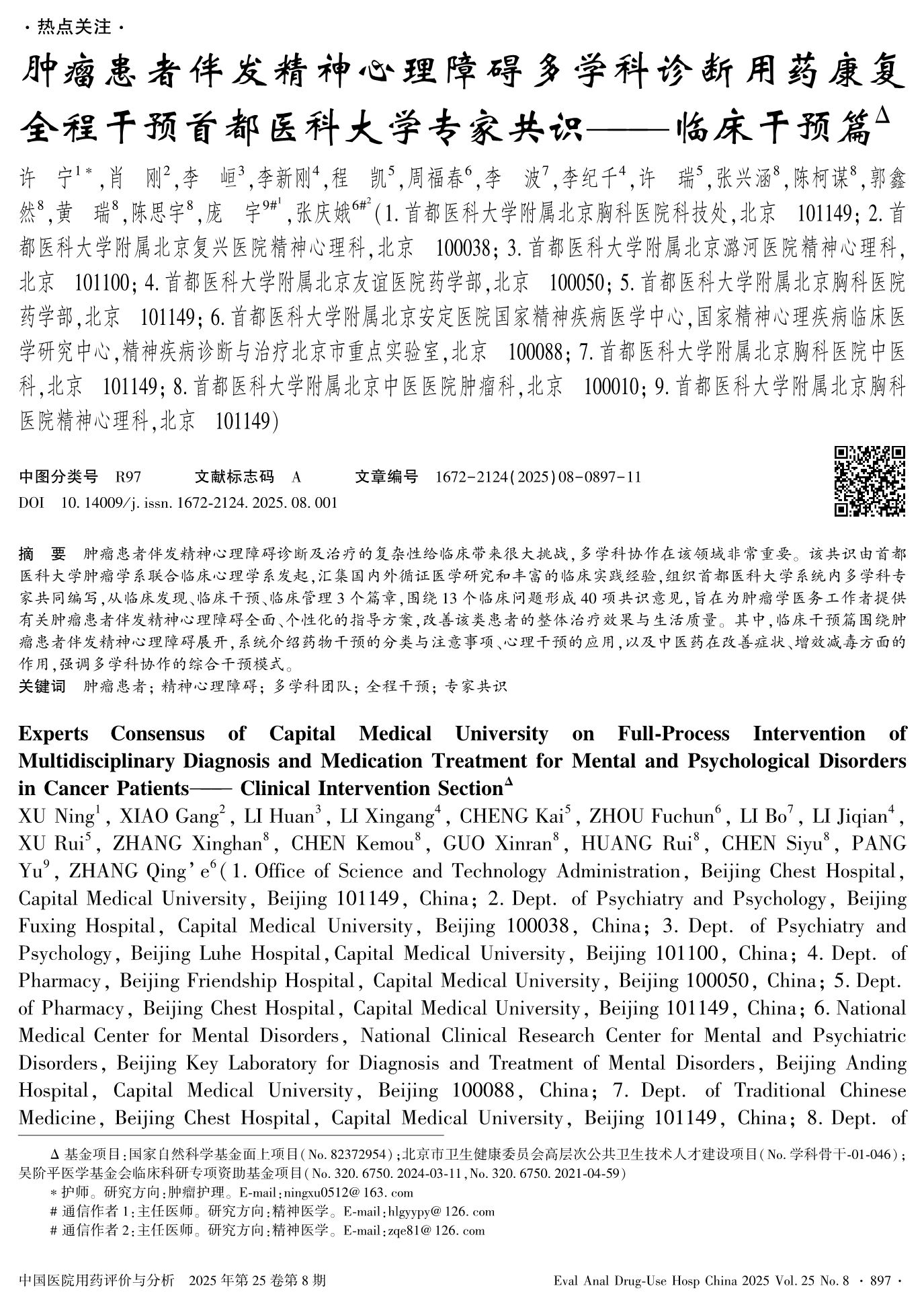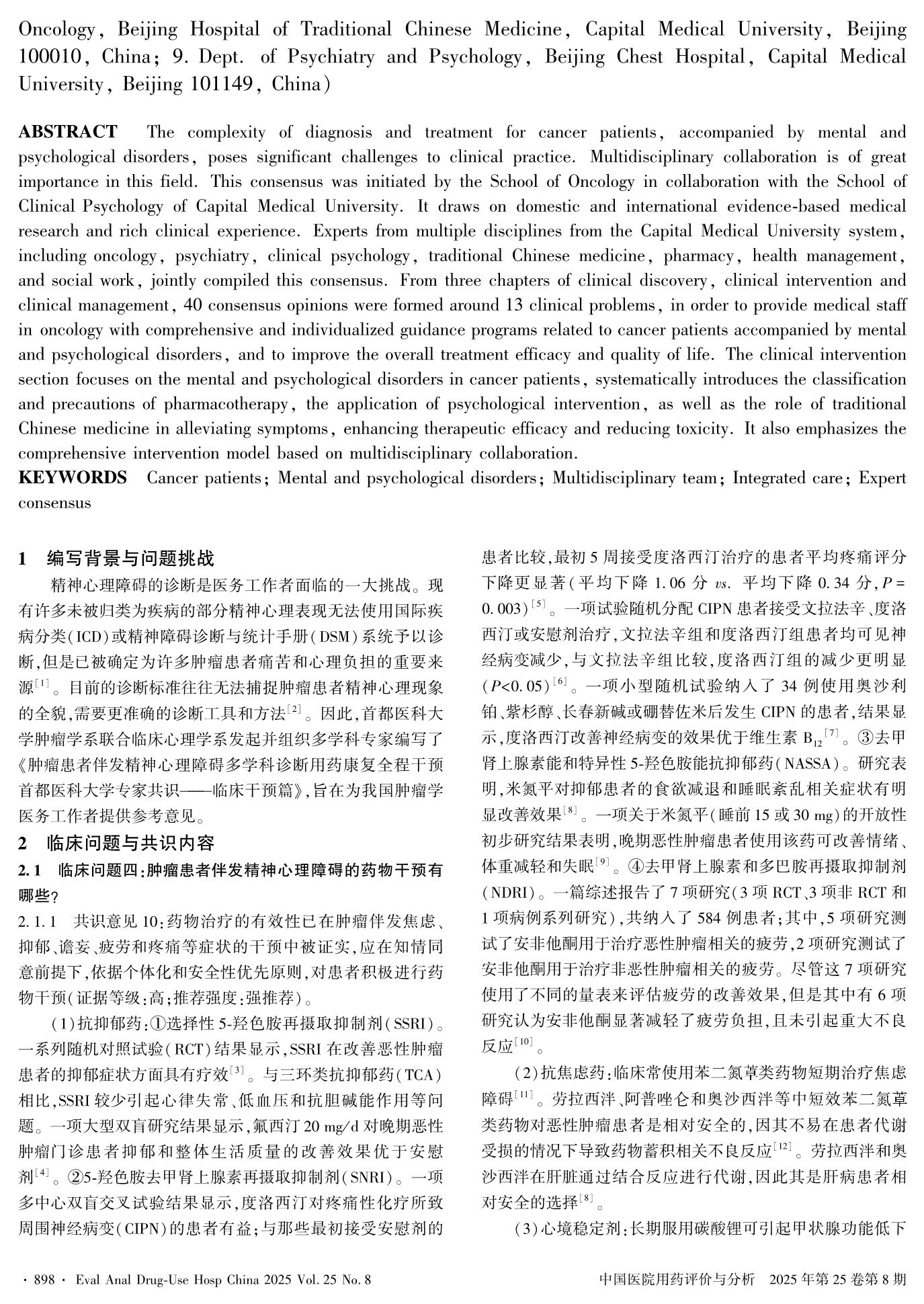 Experts Consensus of Capital Medical University on Full-Process Intervention of Multidisciplinary Diagnosis and Medication Treatment for Mental and Psychological Disorders in Cancer Patients——— Clinical Intervention Section