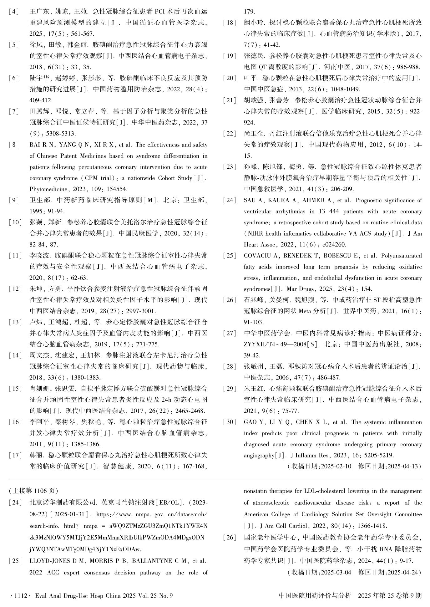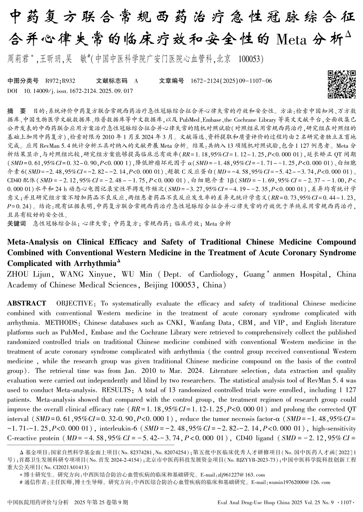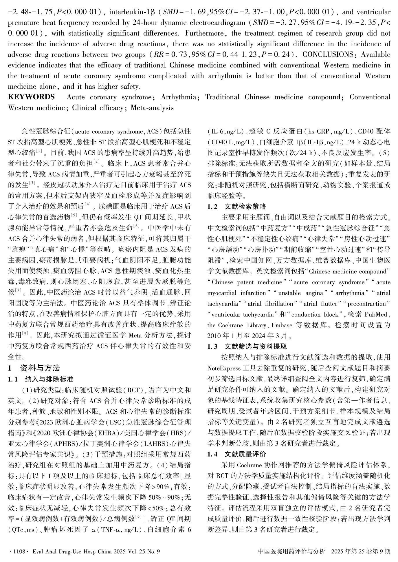 Meta-Analysis on Clinical Efficacy and Safety of Traditional Chinese Medicine Compound Combined with Conventional Western Medicine in the Treatment of Acute Coronary Syndrome Complicated with Arrhythmia ZHOU Lijun, WANG Xinyue, WU Min