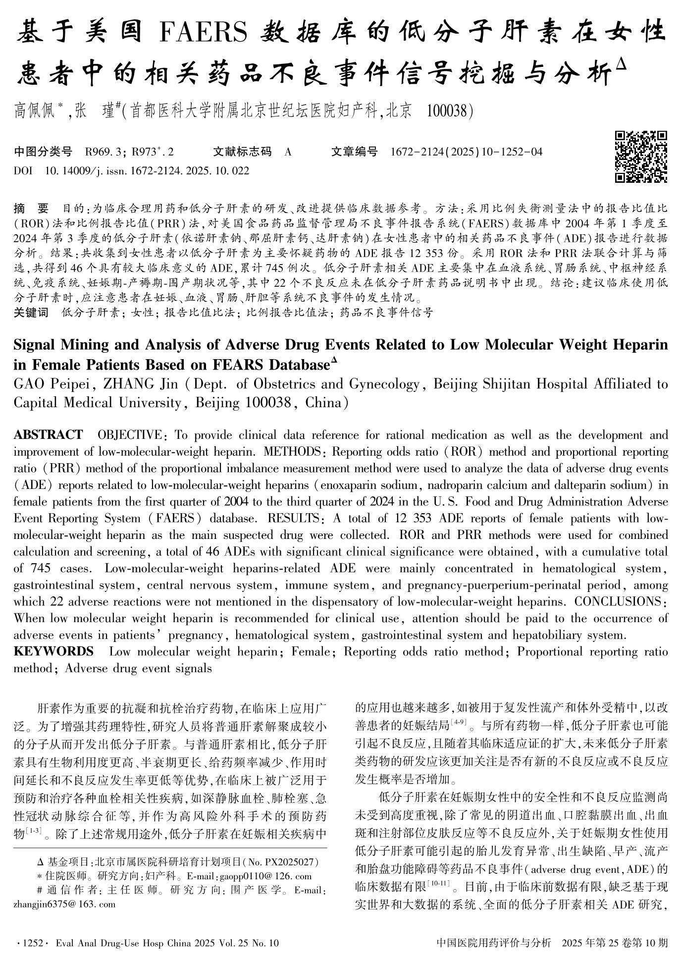 Signal Mining and Analysis of Adverse Drug Events Related to Low Molecular Weight Heparin in Female Patients Based on FEARS Database