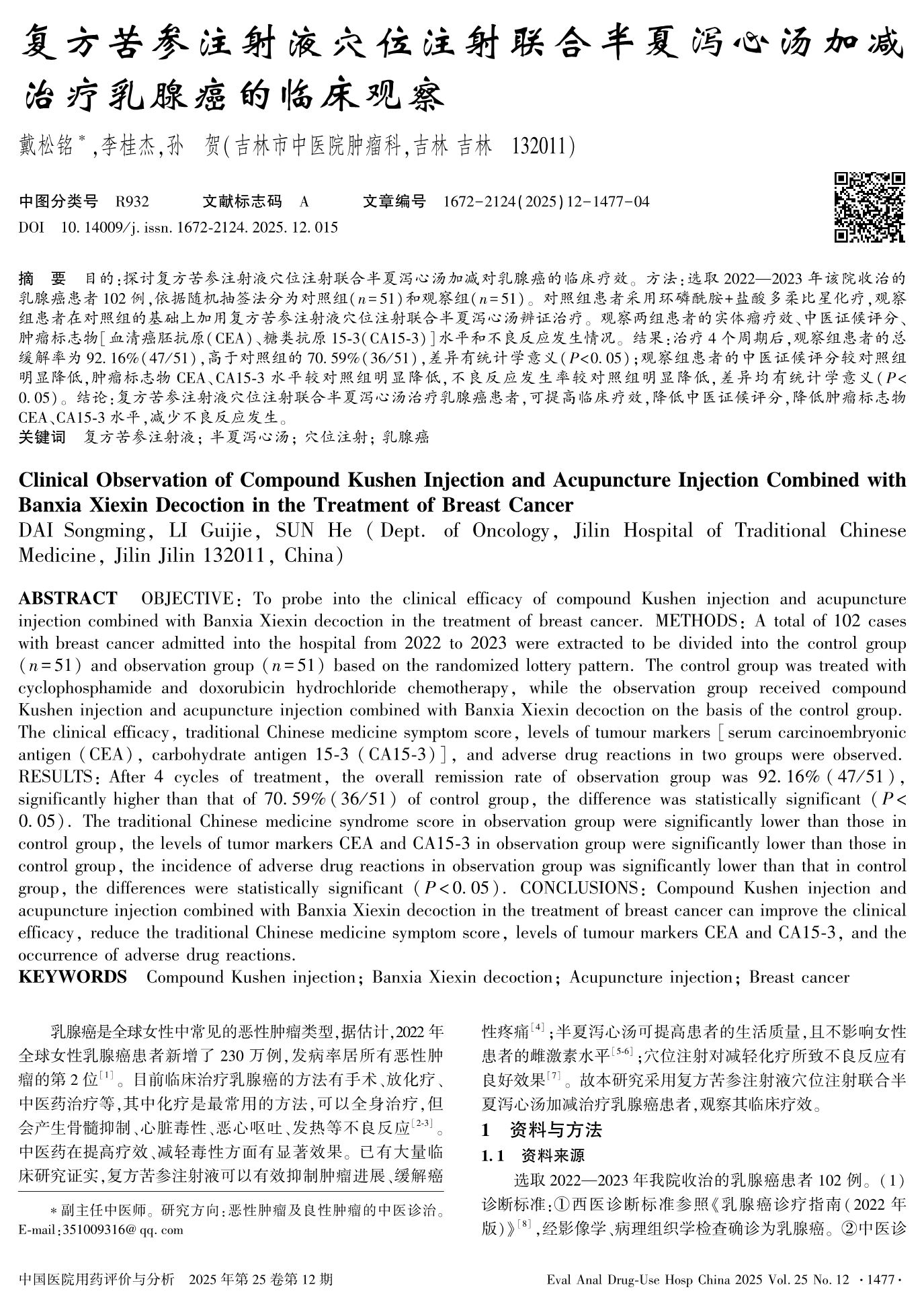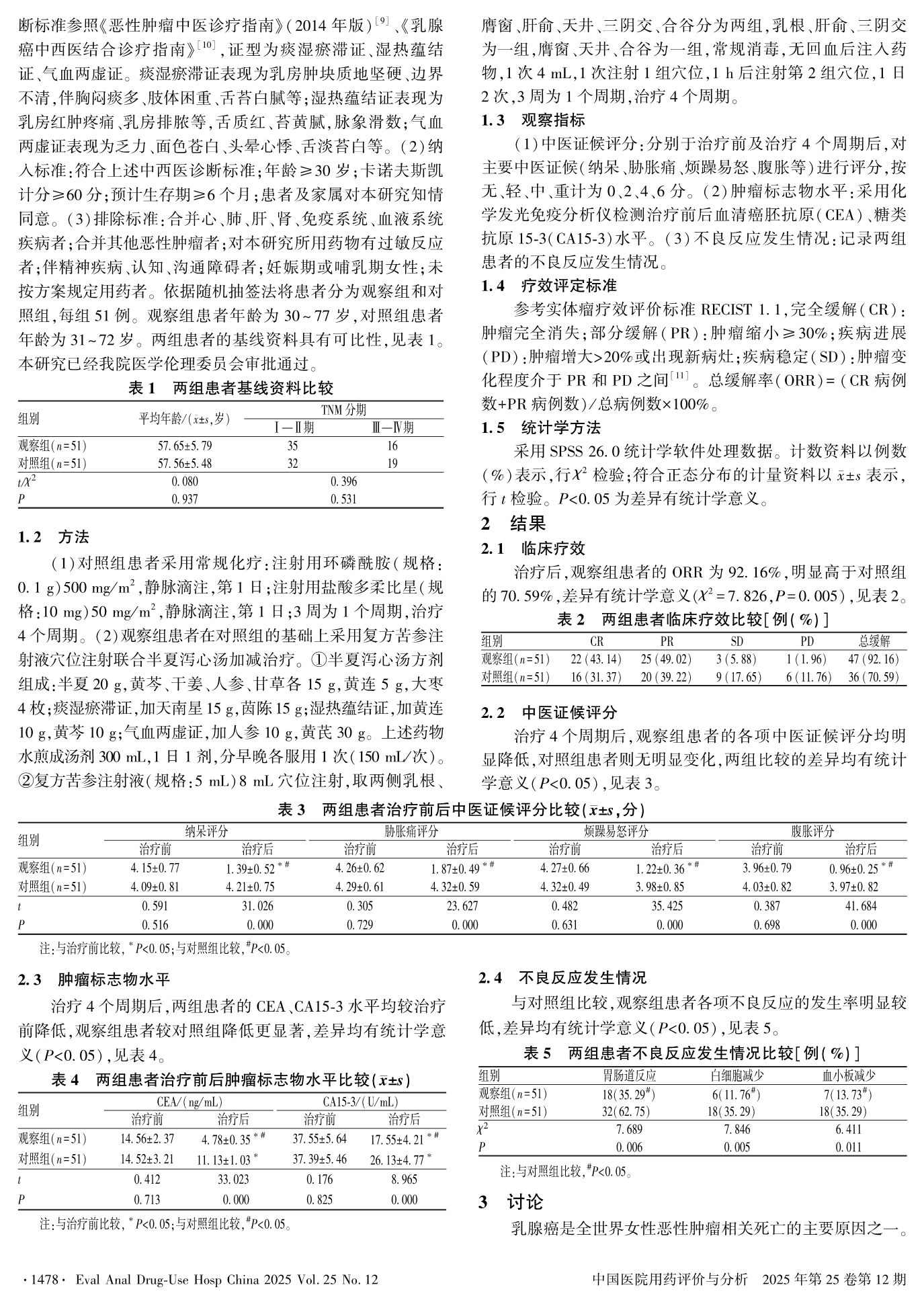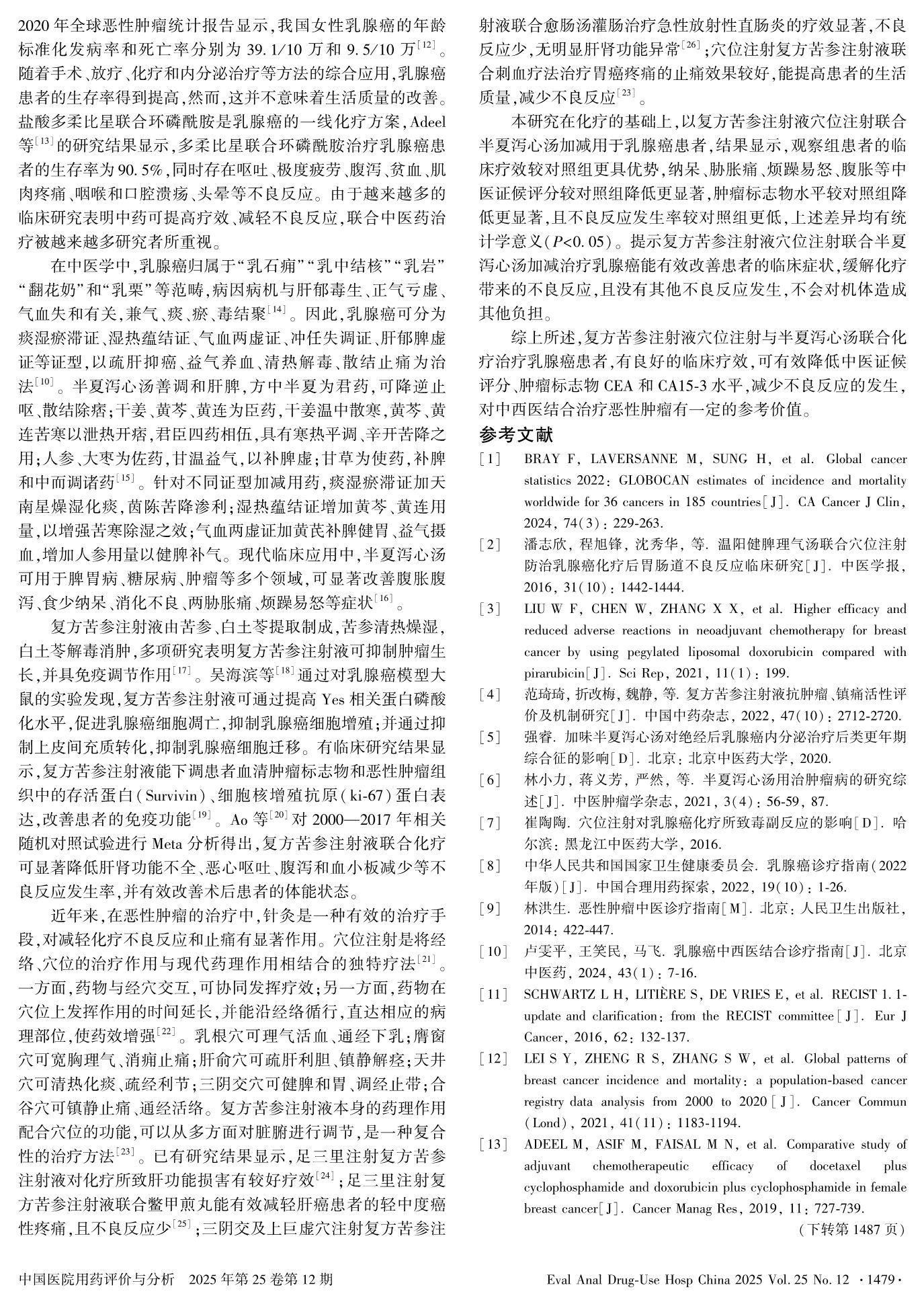 复方苦参注射液穴位注射联合半夏泻心汤加减治疗乳腺癌的临床观察