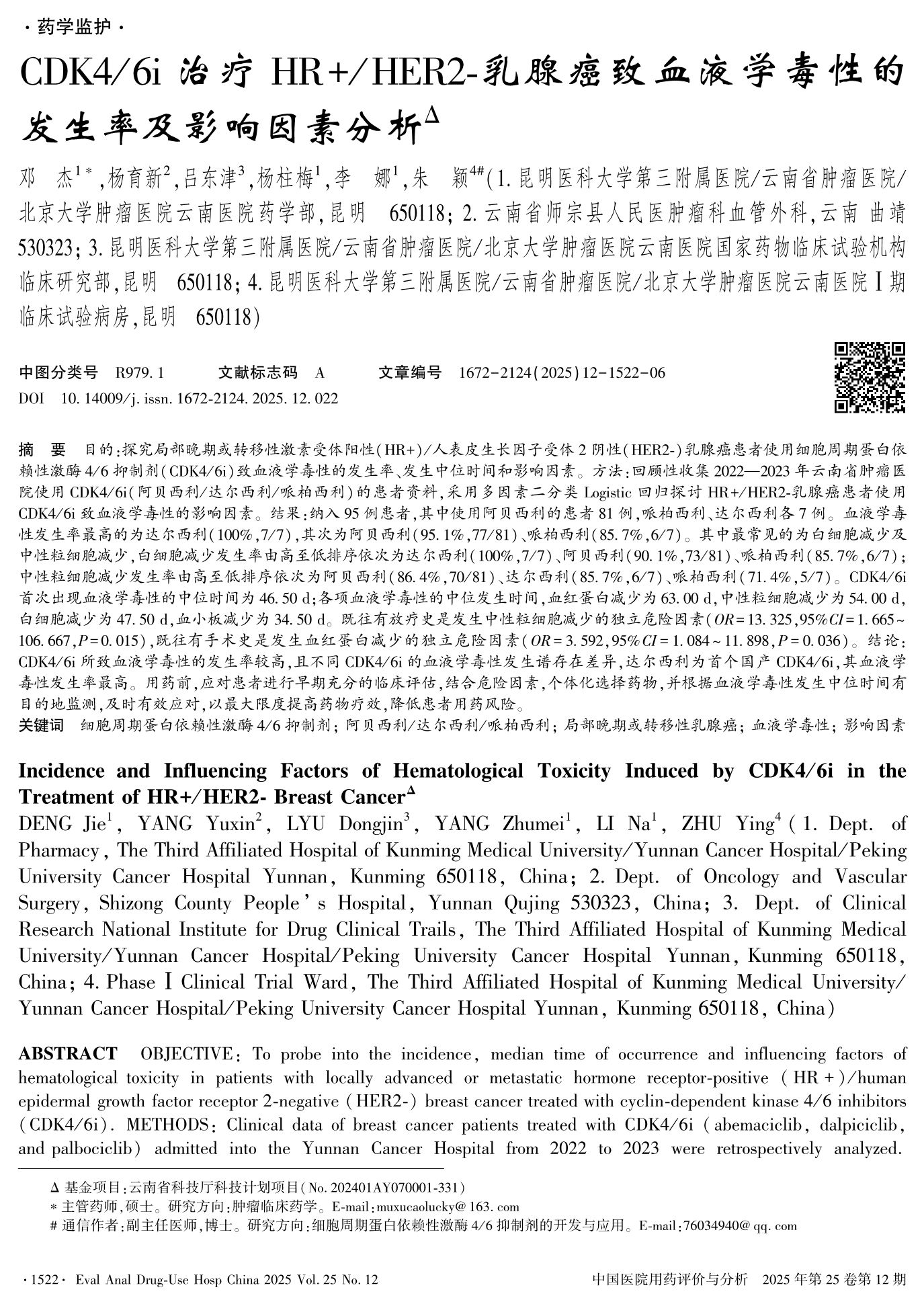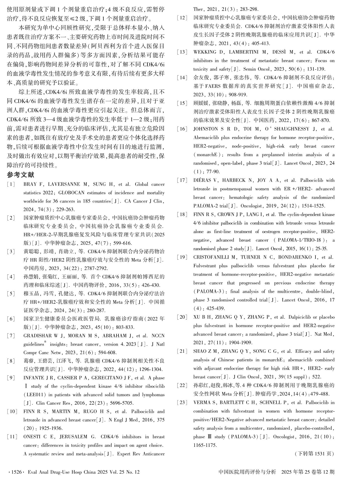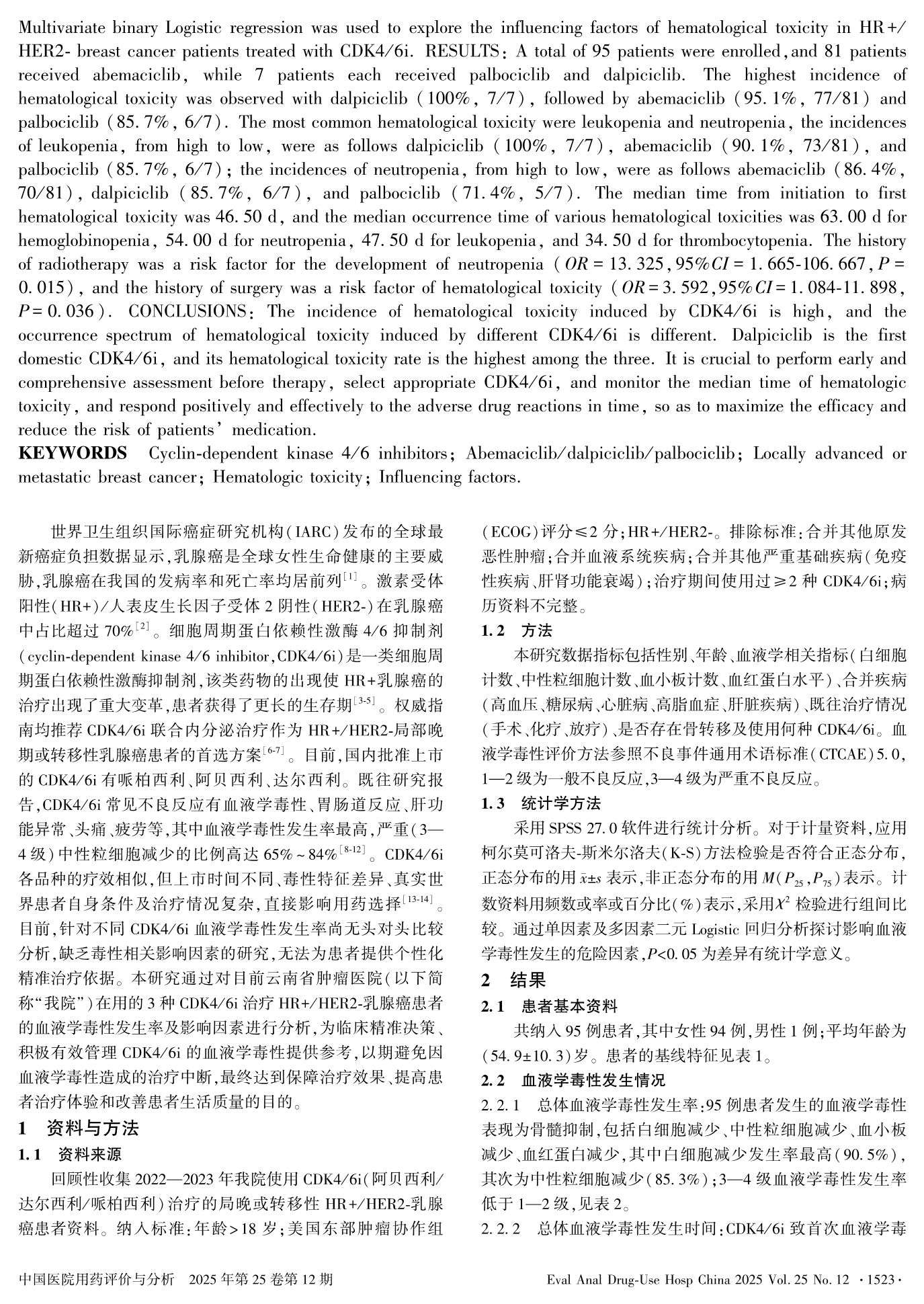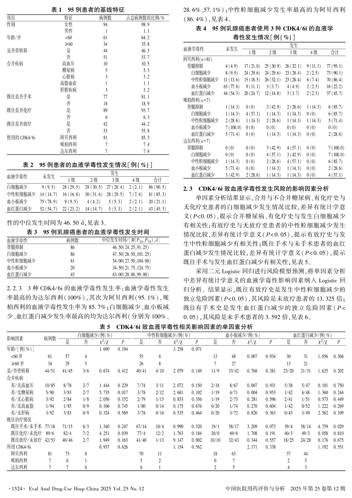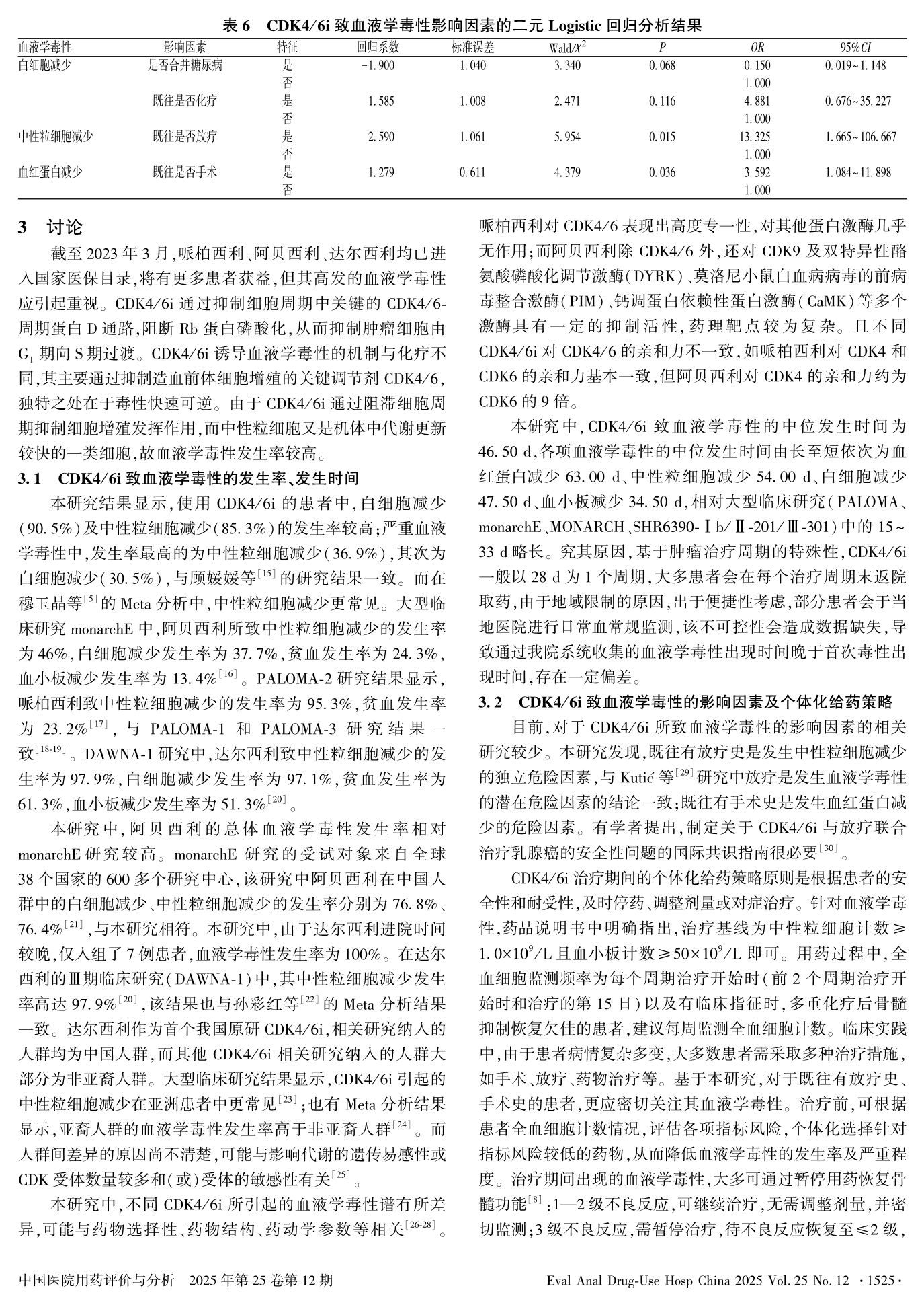 CDK4/6i治疗HR+/HER2-乳腺癌致血液学毒性的发生率及影响因素分析