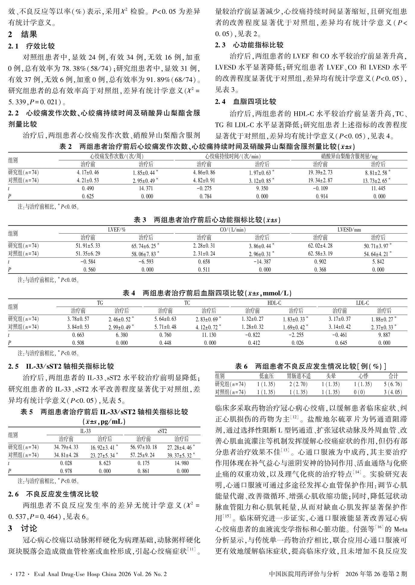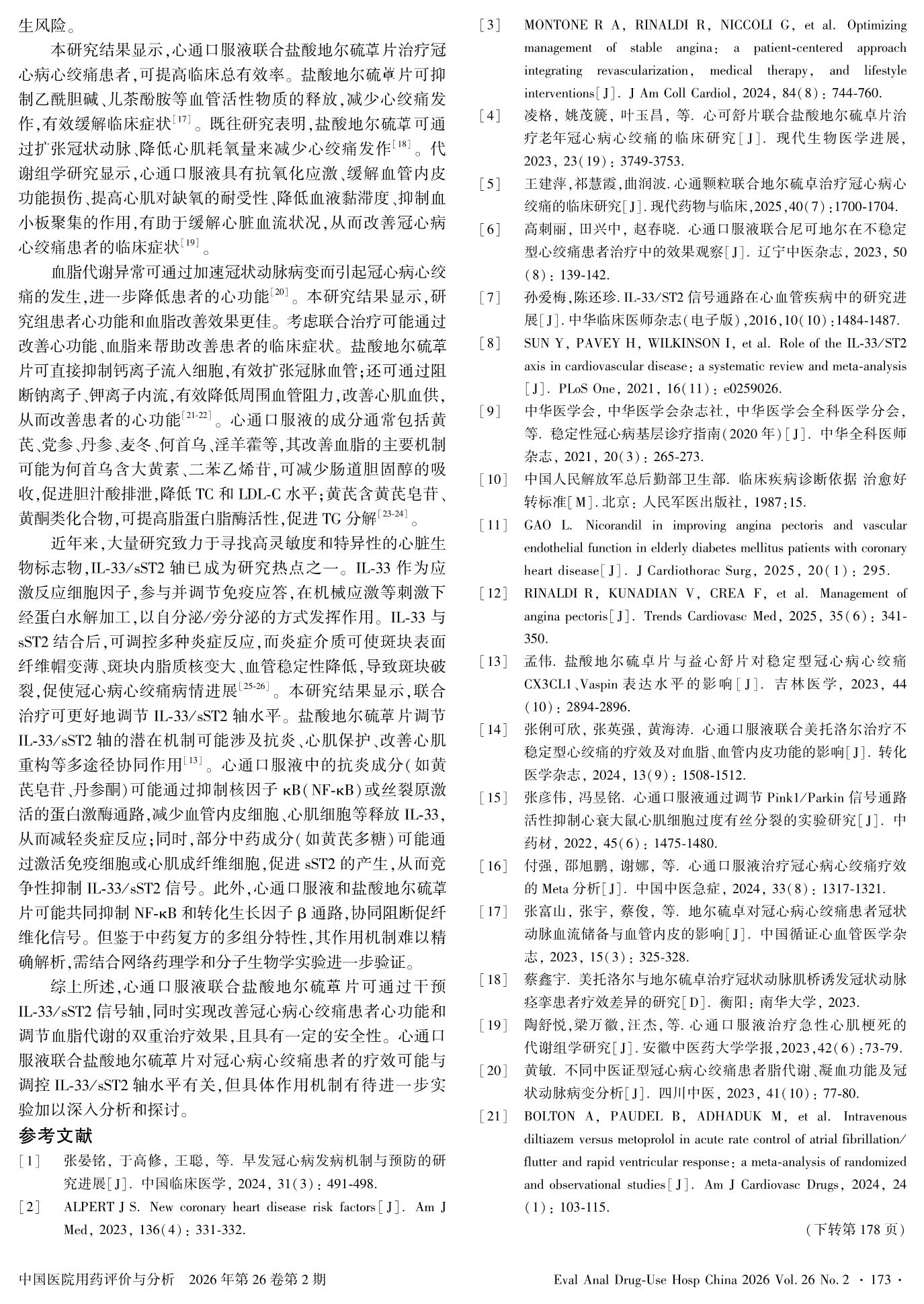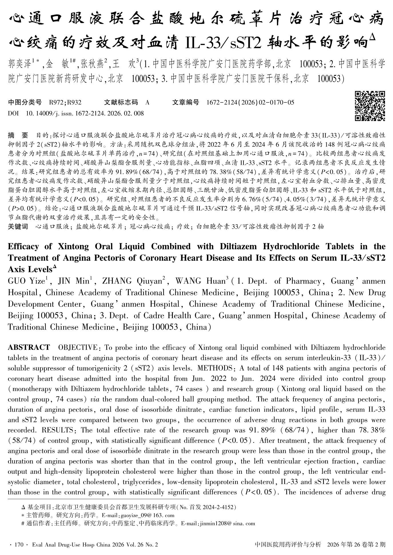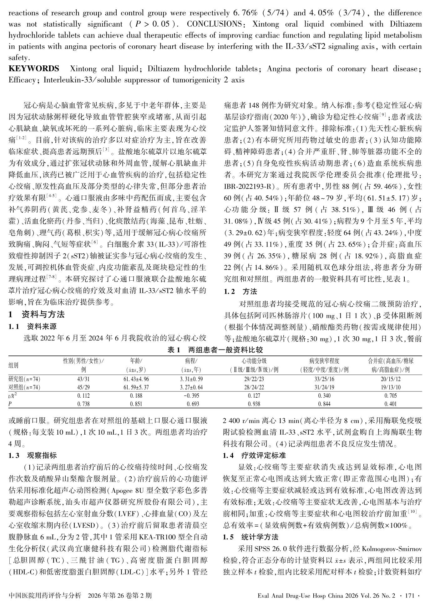 心通口服液联合盐酸地尔硫片治疗冠心病心绞痛的疗效及对血清IL-33/sST2轴水平的影响