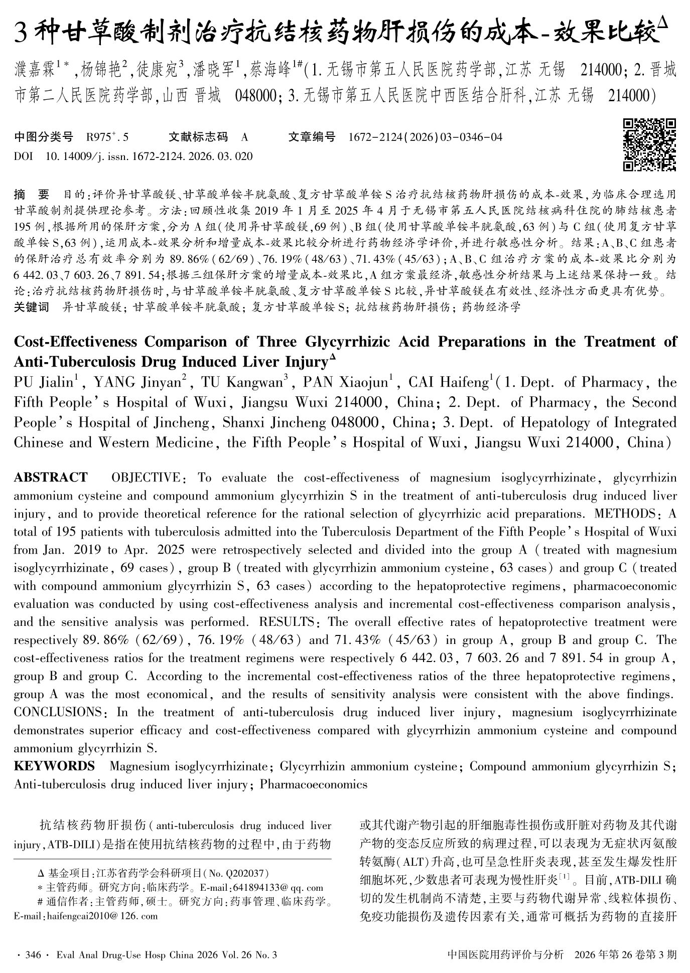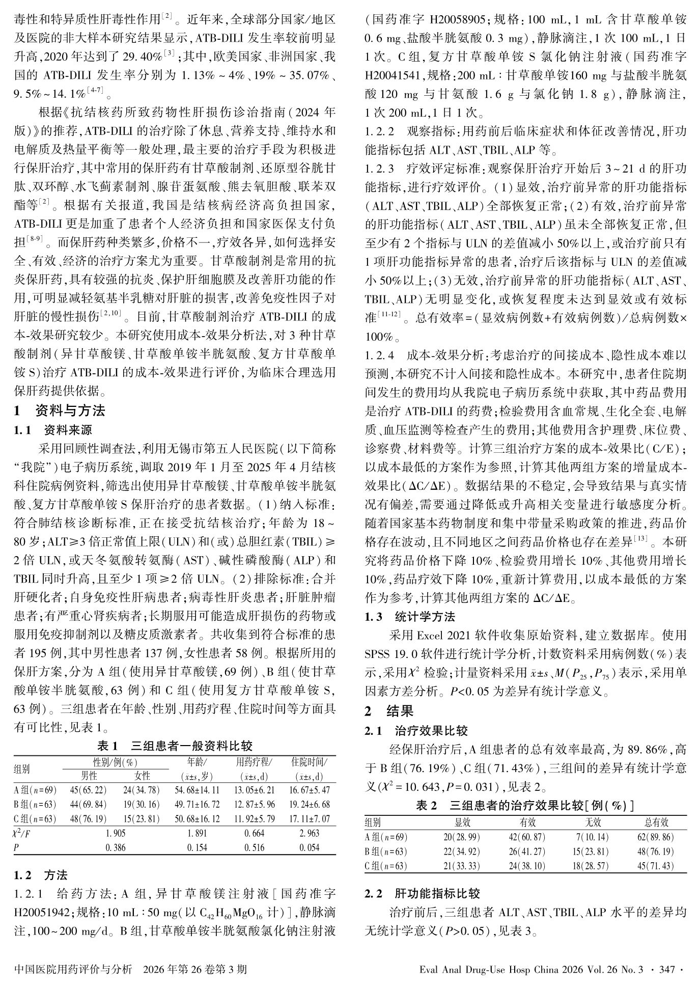 3种甘草酸制剂治疗抗结核药物肝损伤的成本-效果比较