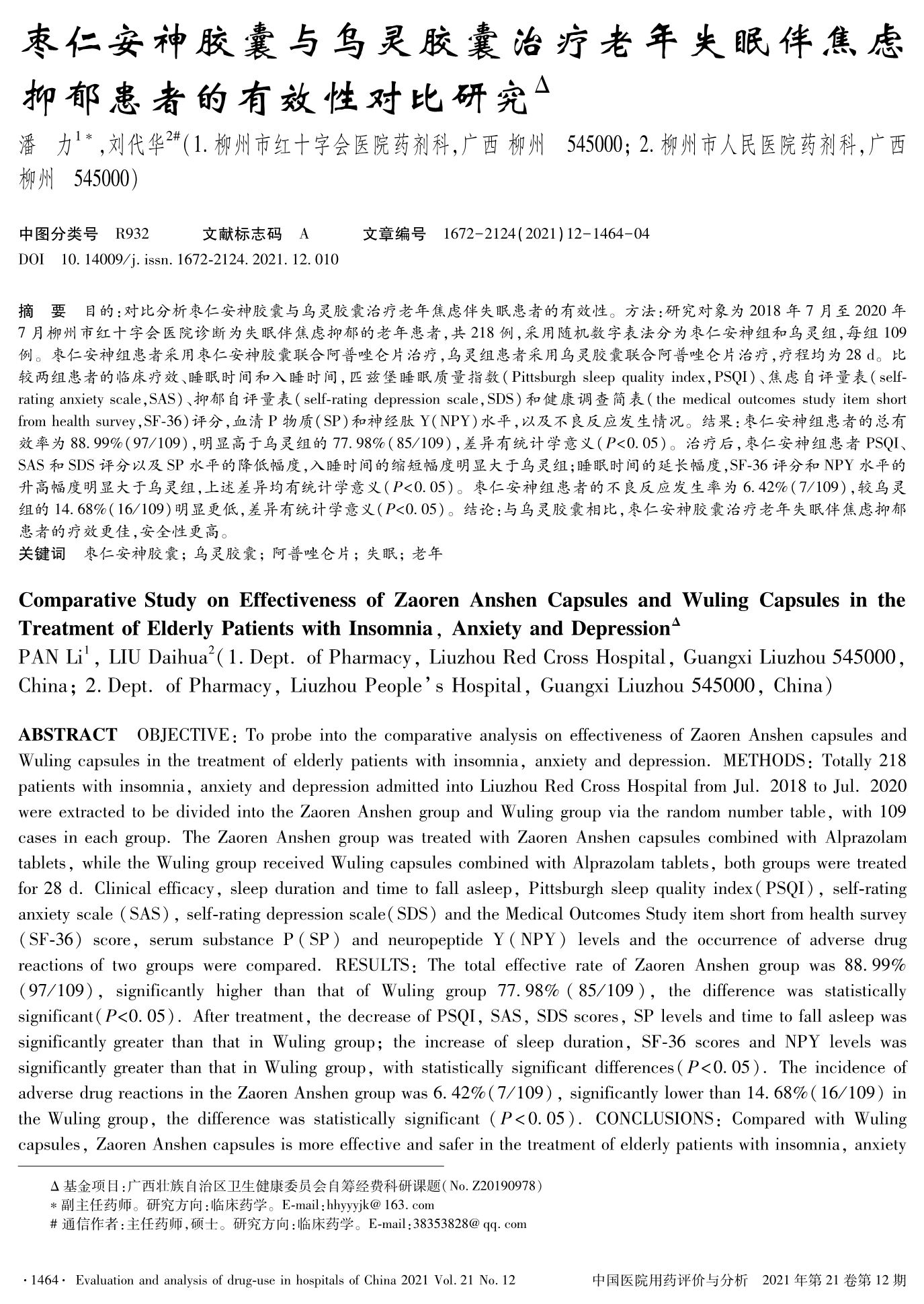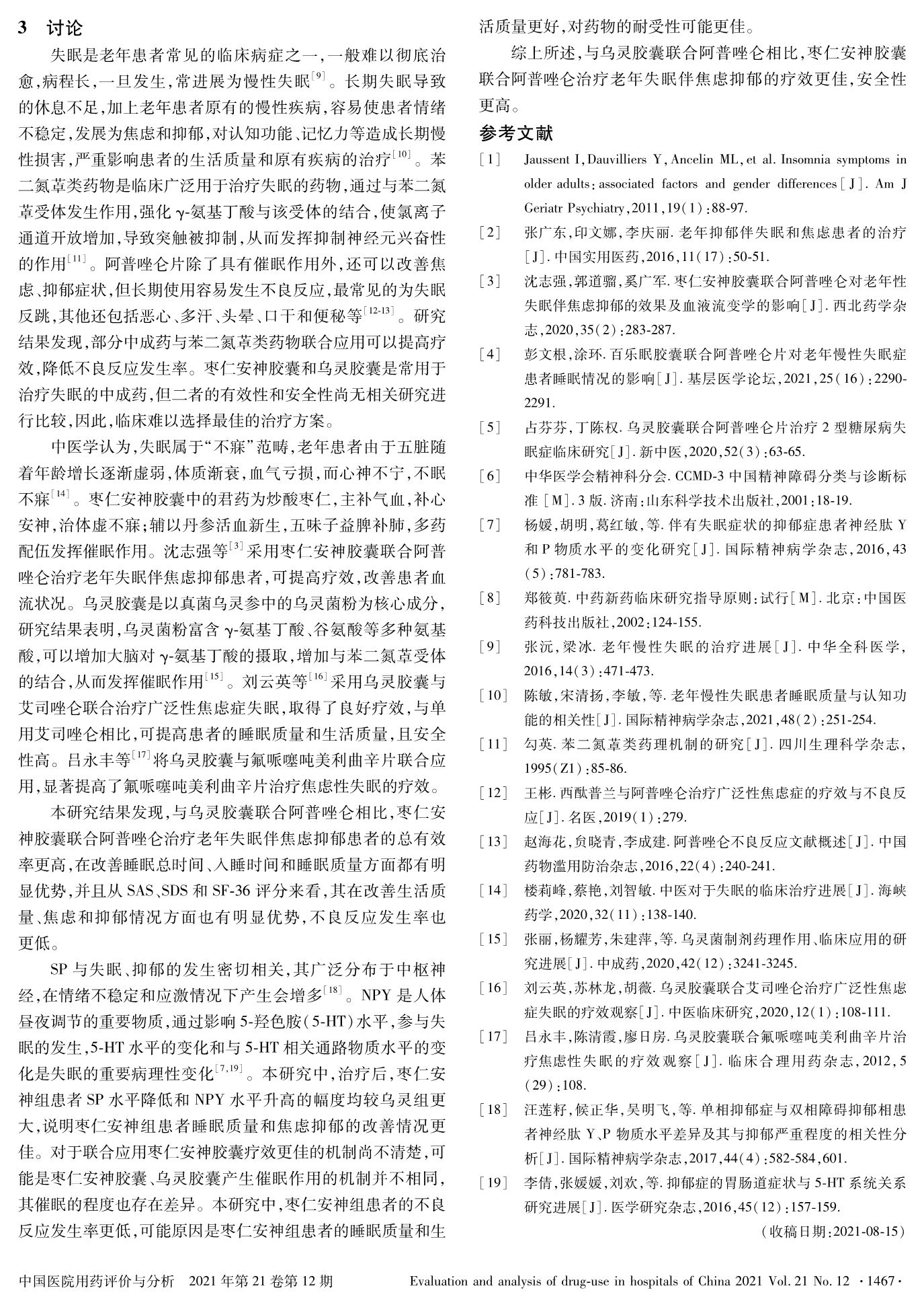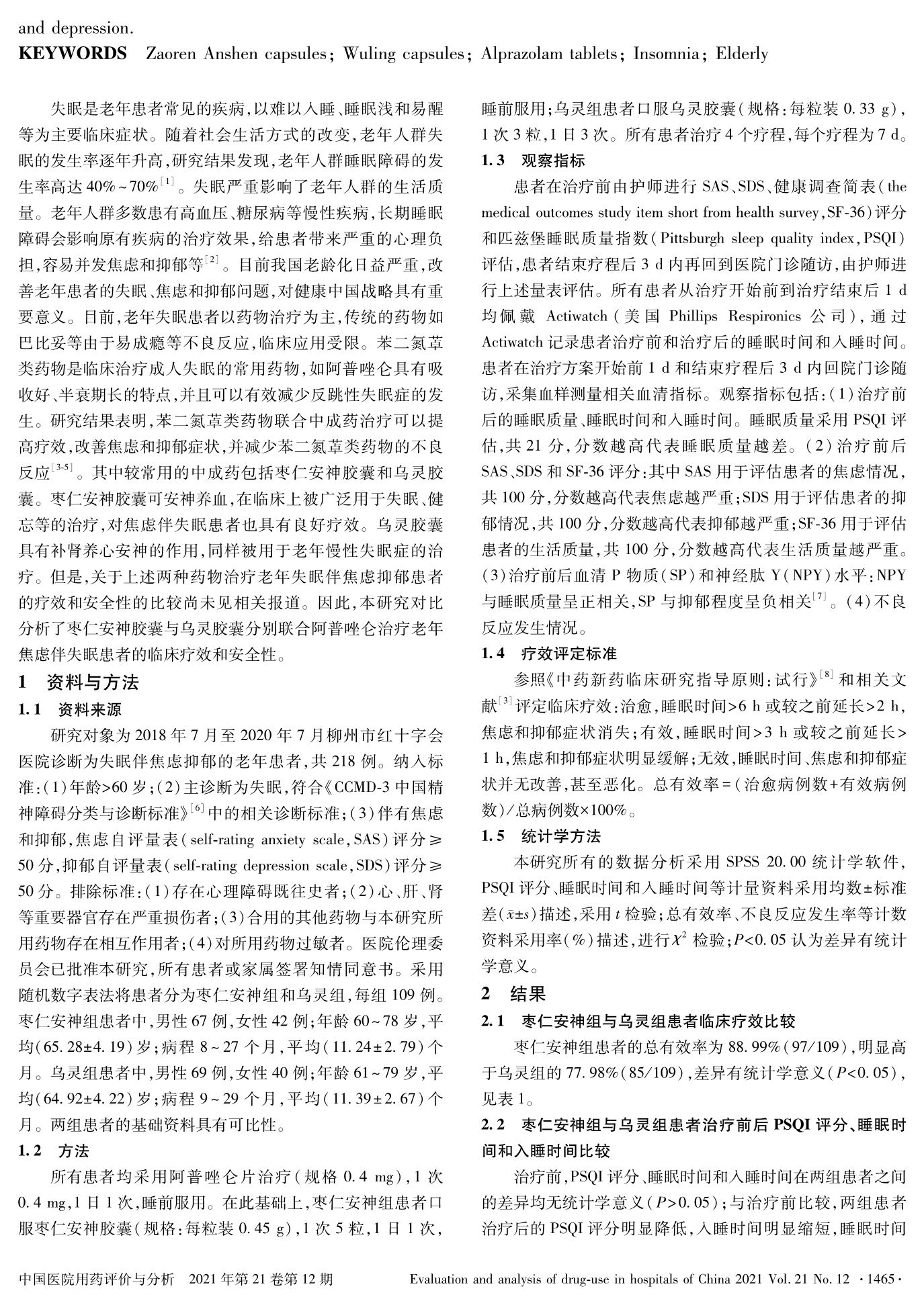 枣仁安神胶囊与乌灵胶囊治疗老年失眠伴焦虑抑郁患者的有效性对比研究