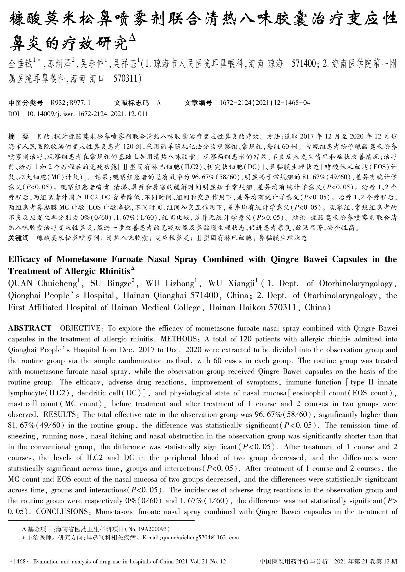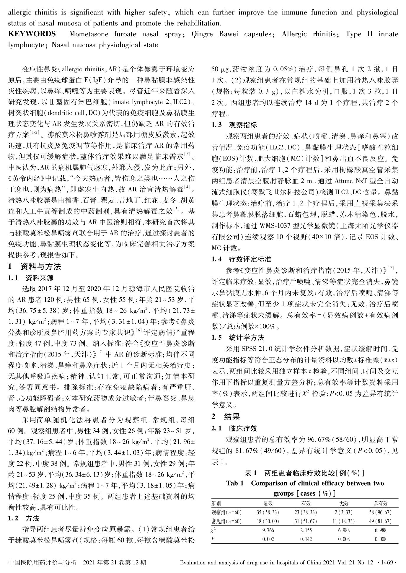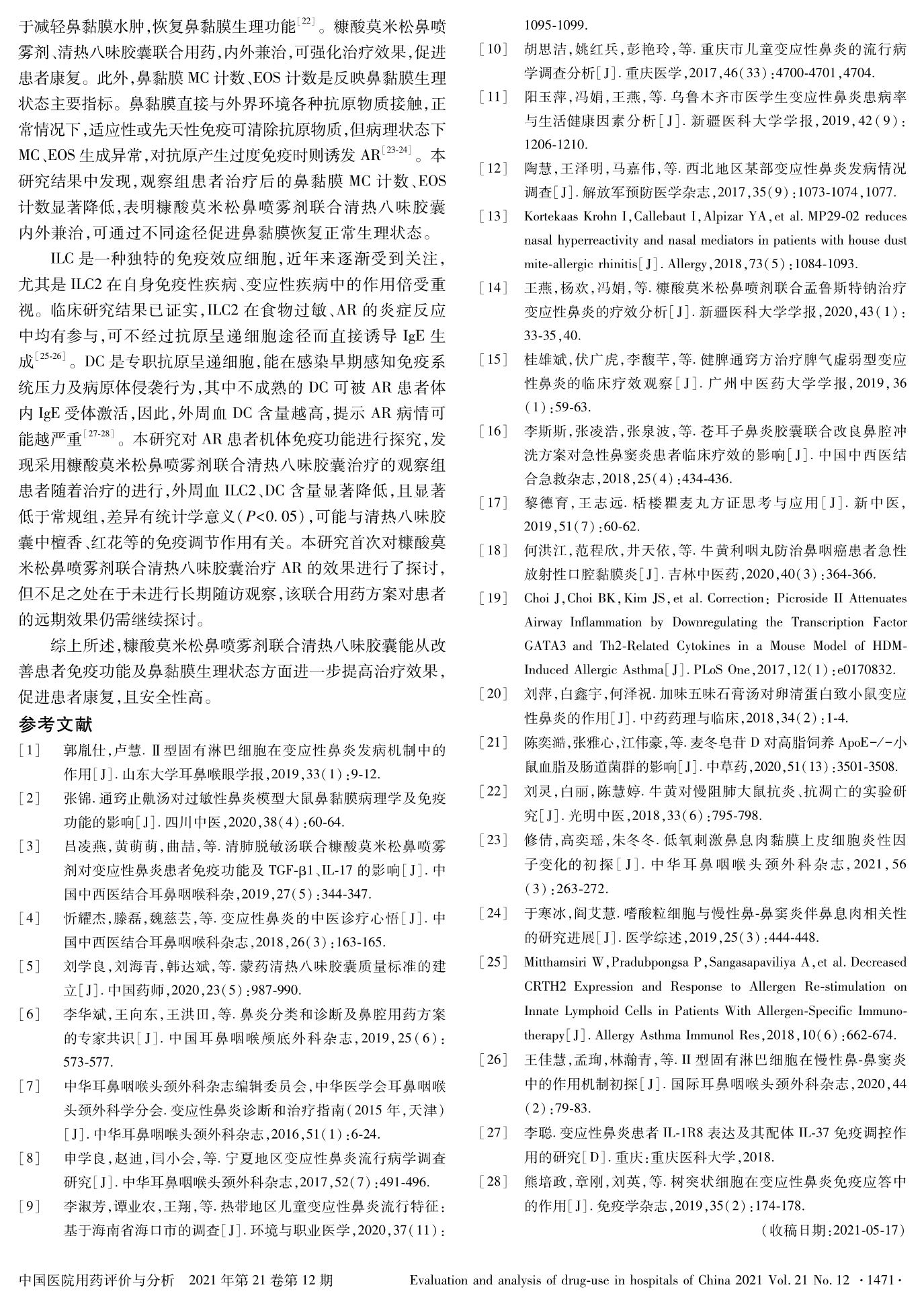糠酸莫米松鼻喷雾剂联合清热八味胶囊治疗变应性鼻炎的疗效研究