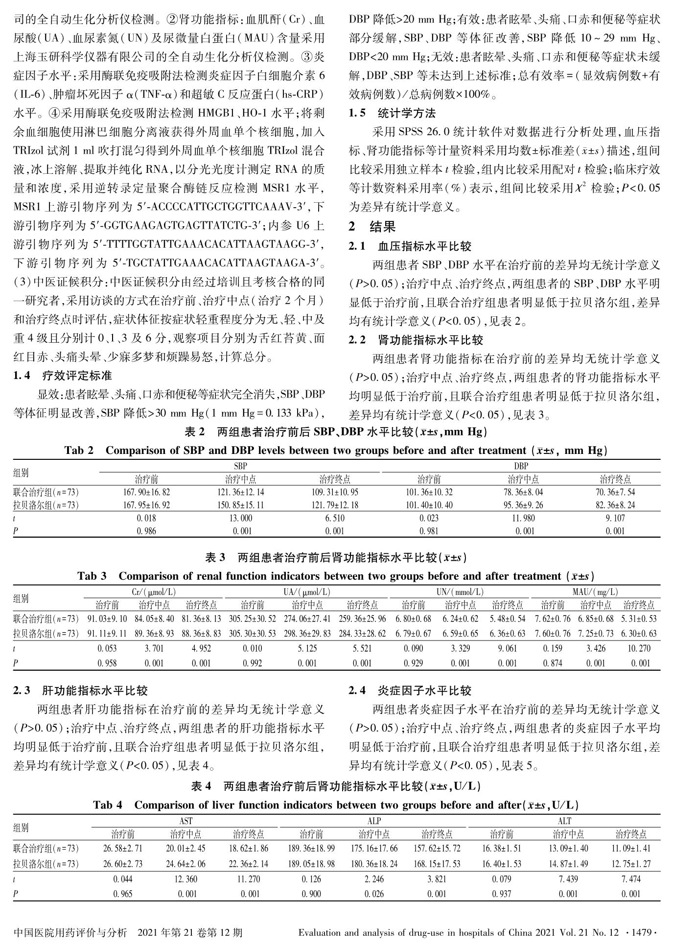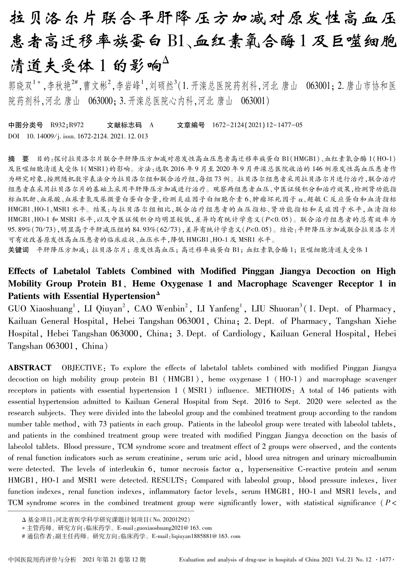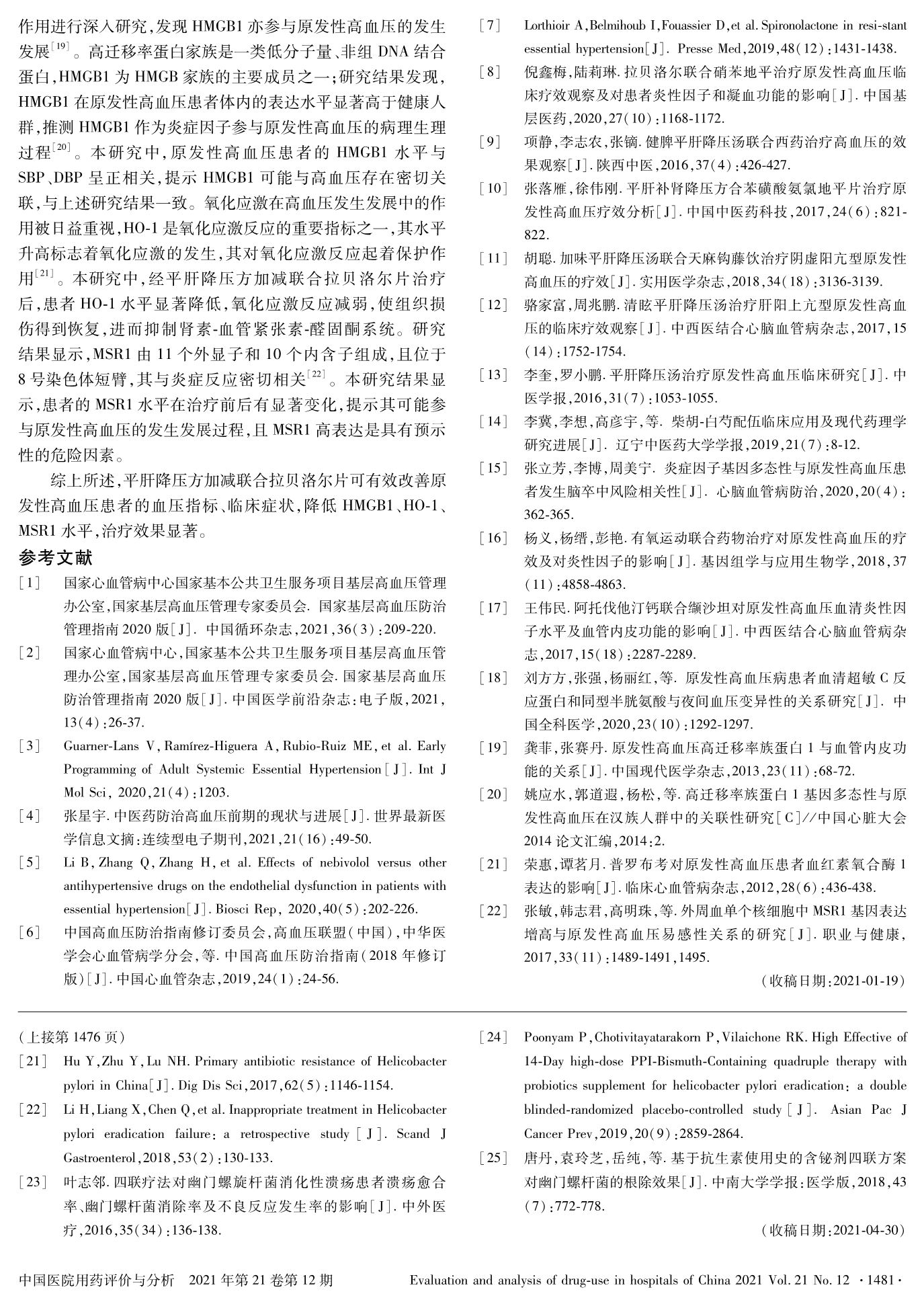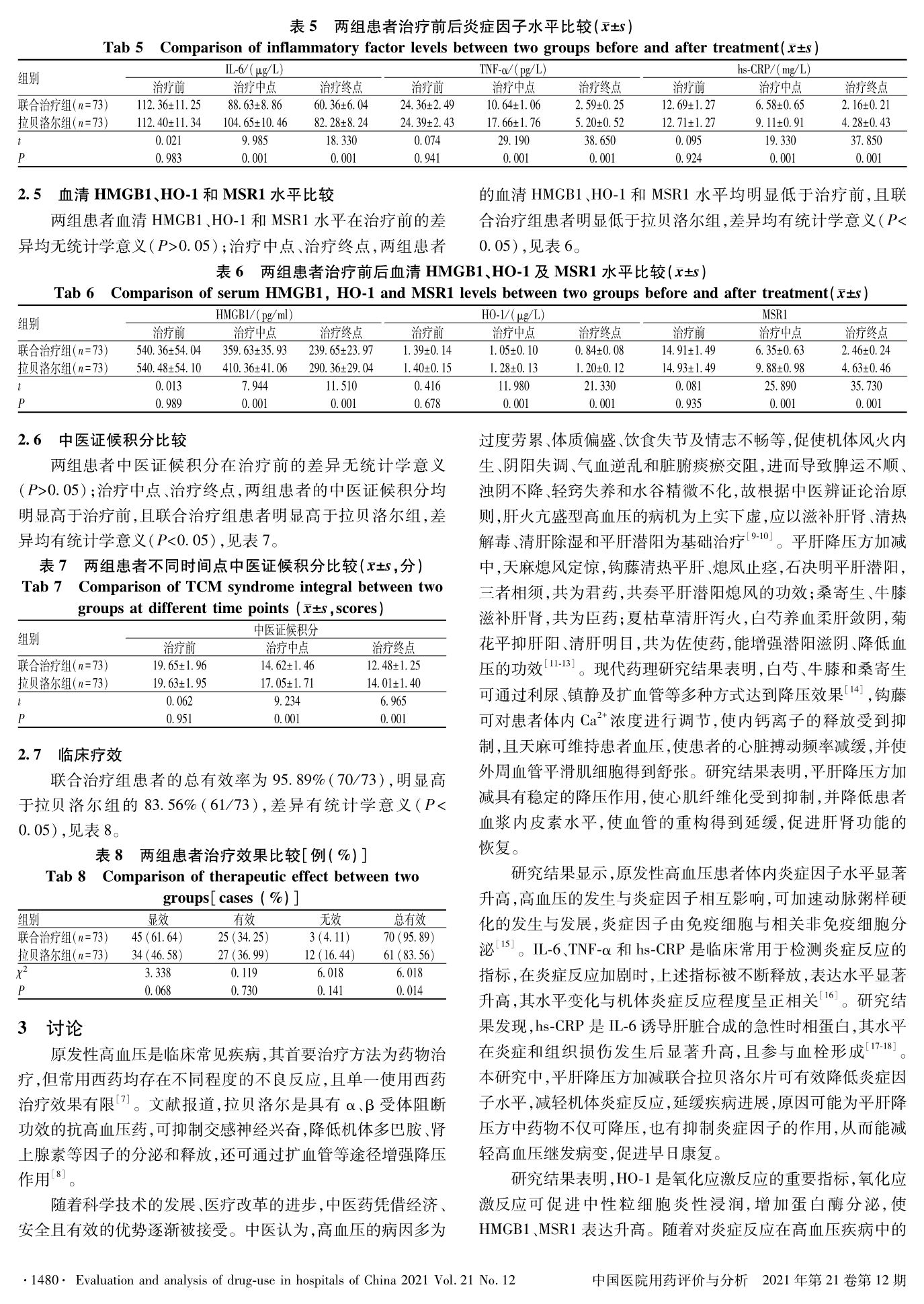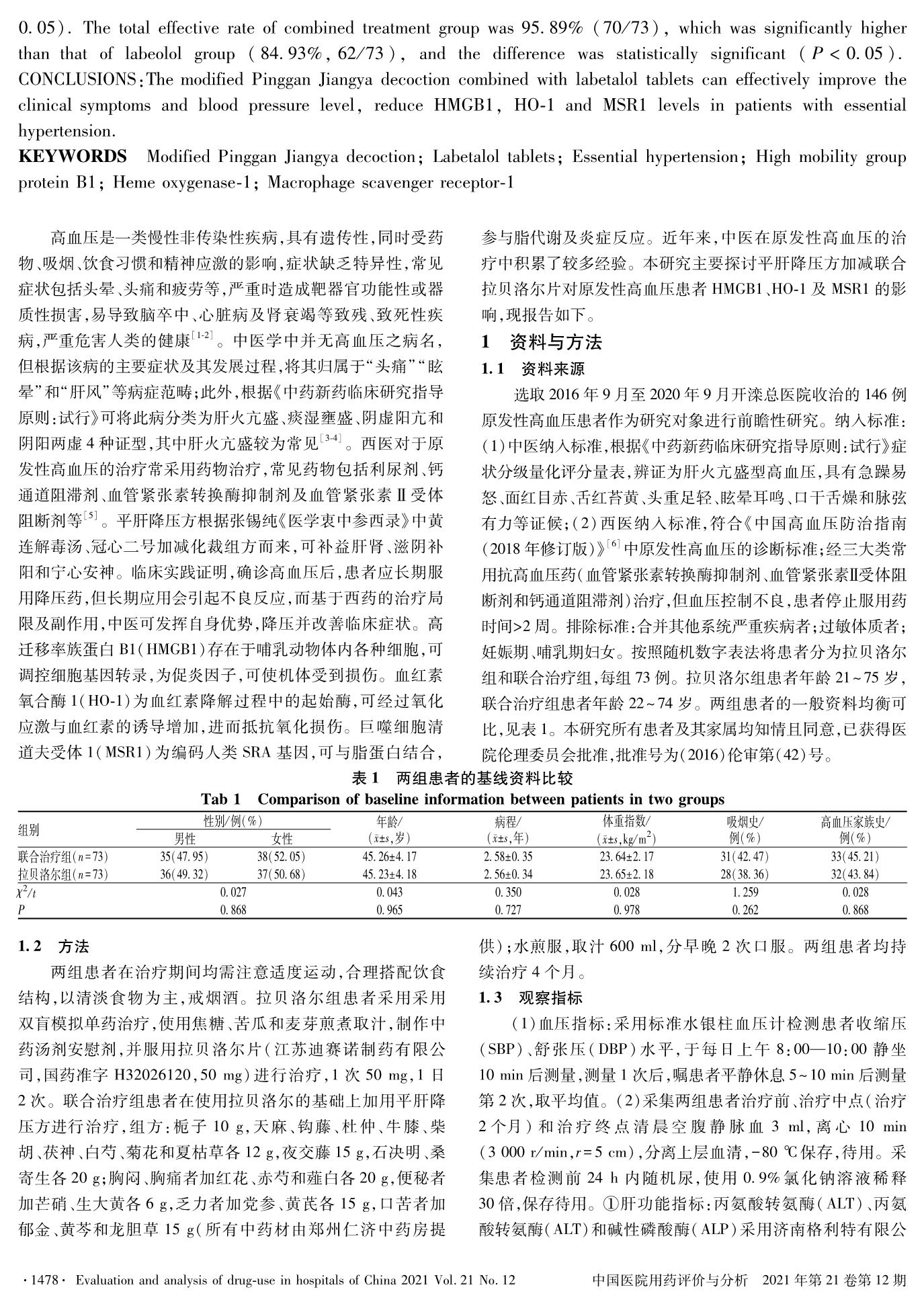 拉贝洛尔片联合平肝降压方加减对原发性高血压患者高迁移率族蛋白B1、血红素氧合酶1及巨噬细胞清道夫受体1的影响